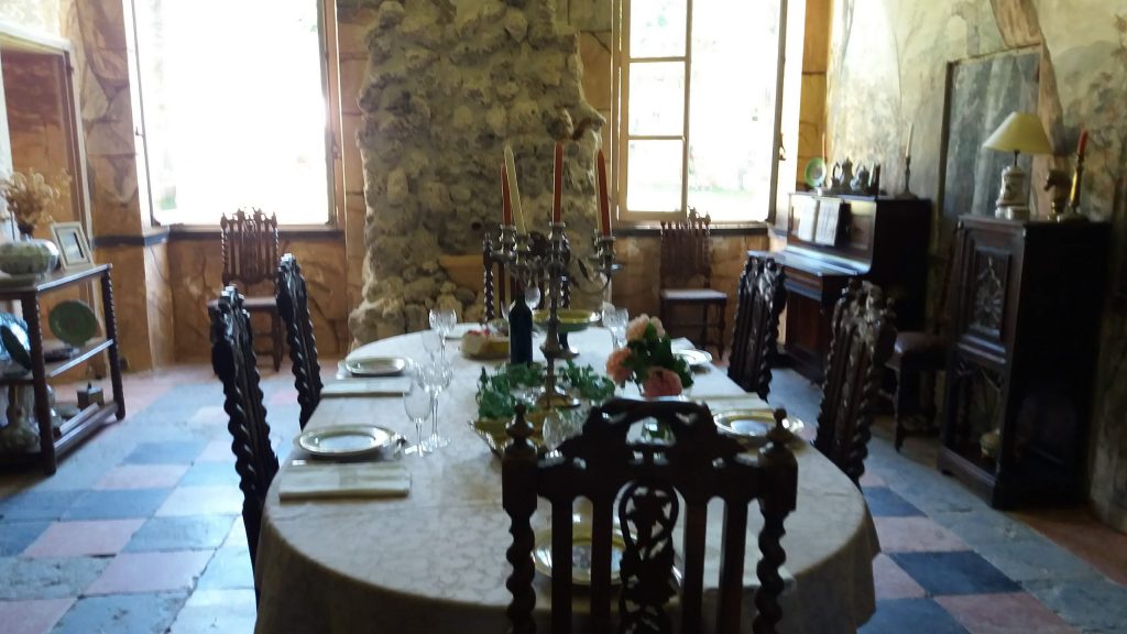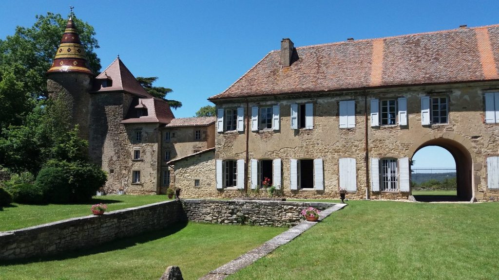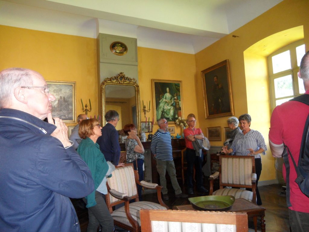 Notre hôte, Olivier Auriol de Bussy, nous a ensuite accueilli pour la visite de son château commentée par Laurence Pinzetta. Acheté à l’état de ruine, ce château orphelin est devenu une jolie bâtisse : l’œuvre de 30 ans de travail colossal de restauration. Construit comme une maison forte au 14ème siècle et remanié au 18ème siècle avec des peintures murales originales sur le thème de la nature, il appartenait autrefois à la famille de Vallin. Ce fût l’occasion d’évoquer l’histoire des deux grandes familles dauphinoises : les de Virieu et les de Clermont. L’Isère est le département français qui comporte le plus de châteaux et maisons fortes !