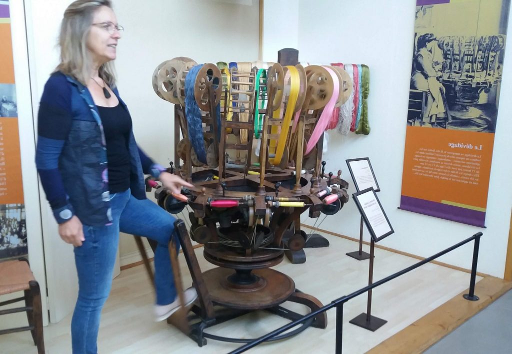 Le musée présente beaucoup de métiers fabriqués autrefois dans la région et maintenus opérationnels grâce à des bénévoles. Avec un discours technique bien documenté, notre conférencière, Corinne Rodriguez, nous a transmis ses connaissances, sa passion et son savoir-faire de tisseuse lors de courtes démonstrations. Le temps est passé très très vite !