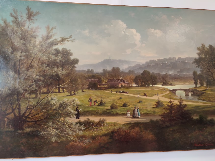Tableau de Antoine Claude Ponthus-Cinier : les deux collines de Lyon, la Croix-Rousse et Fourvière, vues du Parc de la Tête d’Or