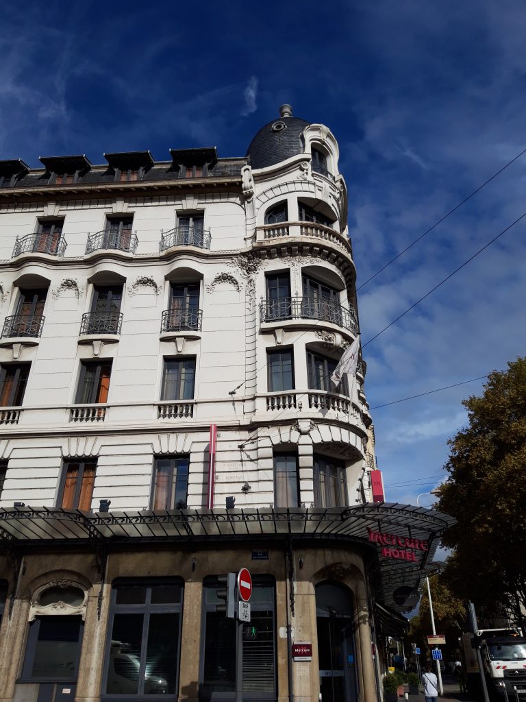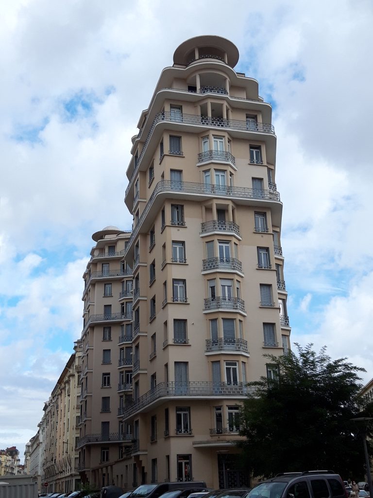 Des immeubles Art Déco, avec son penchant pour les lignes droites et motifs géométriques est largement représenté à Lyon : l’hôtel PLM Lugdunum a été construit entre 1920 et 1924. Le Palais de Flore, à l’époque un des plus hauts immeubles de France, date de 1930. On distingue sur les toits les fameuses coupoles en forme de casques anglais.