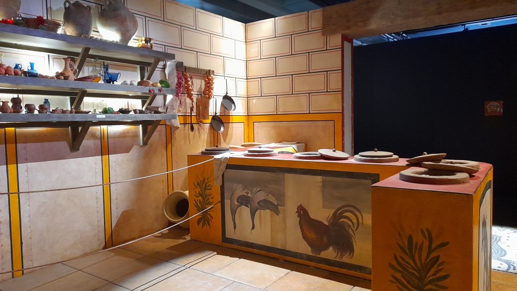 Ce 24 Août, la journée commence normalement à Pompéi. L’exposition dévoile une ville en pleine activité où chacun s’affaire : artisans, agriculteurs, architectes, médecins, géomètres, maçons, fondeurs de métaux, éleveurs. Une cité vibrante, animée, bien vivante…On y découvre même un « fast food » ou « snack bar » appelé à cette époque « Thermopolium«