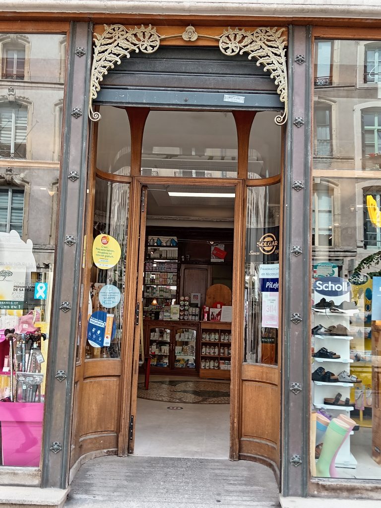 Nous visitons le quartier commerçant, la rue des Dominicains. L’intérieur de la pharmacie du Ginkgo est orné de motifs rappelant l’arbre connu en Extrême-Orient pour ses vertus thérapeutiques, le Crédit Lyonnais et sa verrière aux clématites, et autres édifices qui reflètent le dynamisme de la ville, tels que la brasserie l’Excelsior, aux lustres Majorelle/Daum, mobilier Majorelle, vitraux de Gruber, puis la chambre de commerce ornée de ferronneries de Majorelle et de vitraux de Gruber.