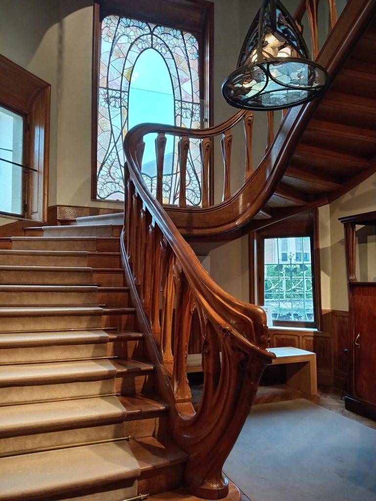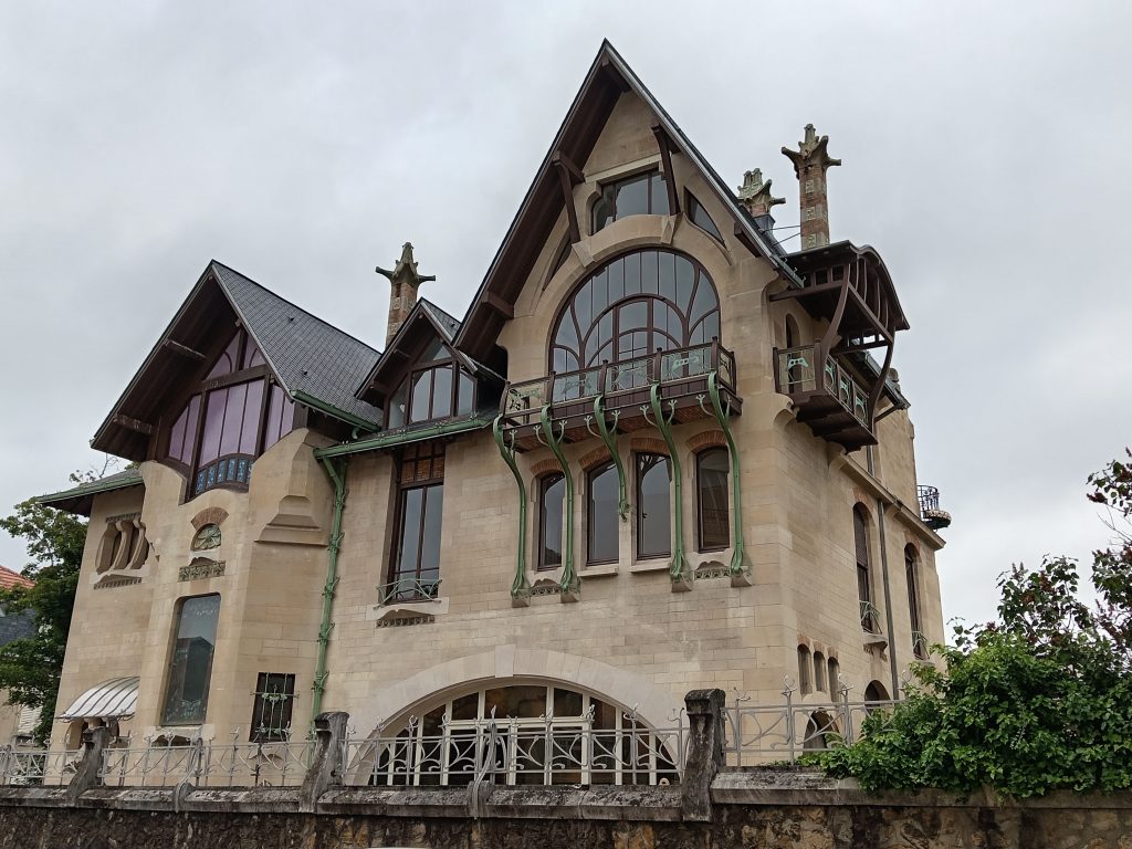 C’est en sur-chaussures que nous visitons la Villa Majorelle. De son vrai nom, villa « Jika » (l’épouse de Louis Majorelle s’appelait Jeanne Kretz, J.K.) cette maison, conçue en 1899 par l’architecte parisien Henri Sauvage fut construite par l’ébéniste Louis Majorelle. Première maison Art nouveau de Nancy, elle s’élevait à l’origine dans un vaste parc, en bordure de la ville. A l’intérieur la salle à manger (cheminée et boiseries) est particulièrement remarquable. En se promenant dans le jardin qui entoure la villa, on peut constater qu’aucune des façades ne se ressemblent.